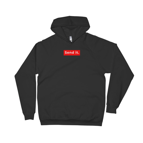 This American Apparel hoodie is made out of California fleece which, opposed to typical synthetic fleece, is made of 100% extra soft ring-spun combed cotton. It's pre-washed to minimize shrinkage, and is breathable yet extra thick for warmth. A thinner, high quality hoodie that features a Supreme-inspired "Send it." logo. Currently only comes in a size medium and large.